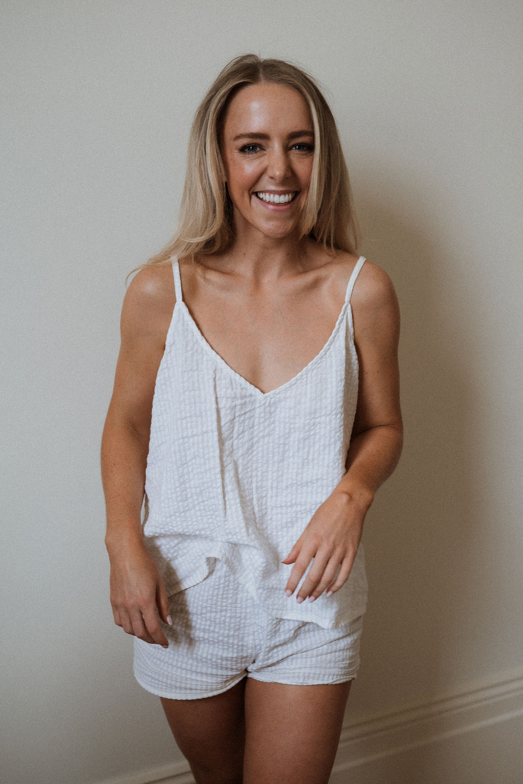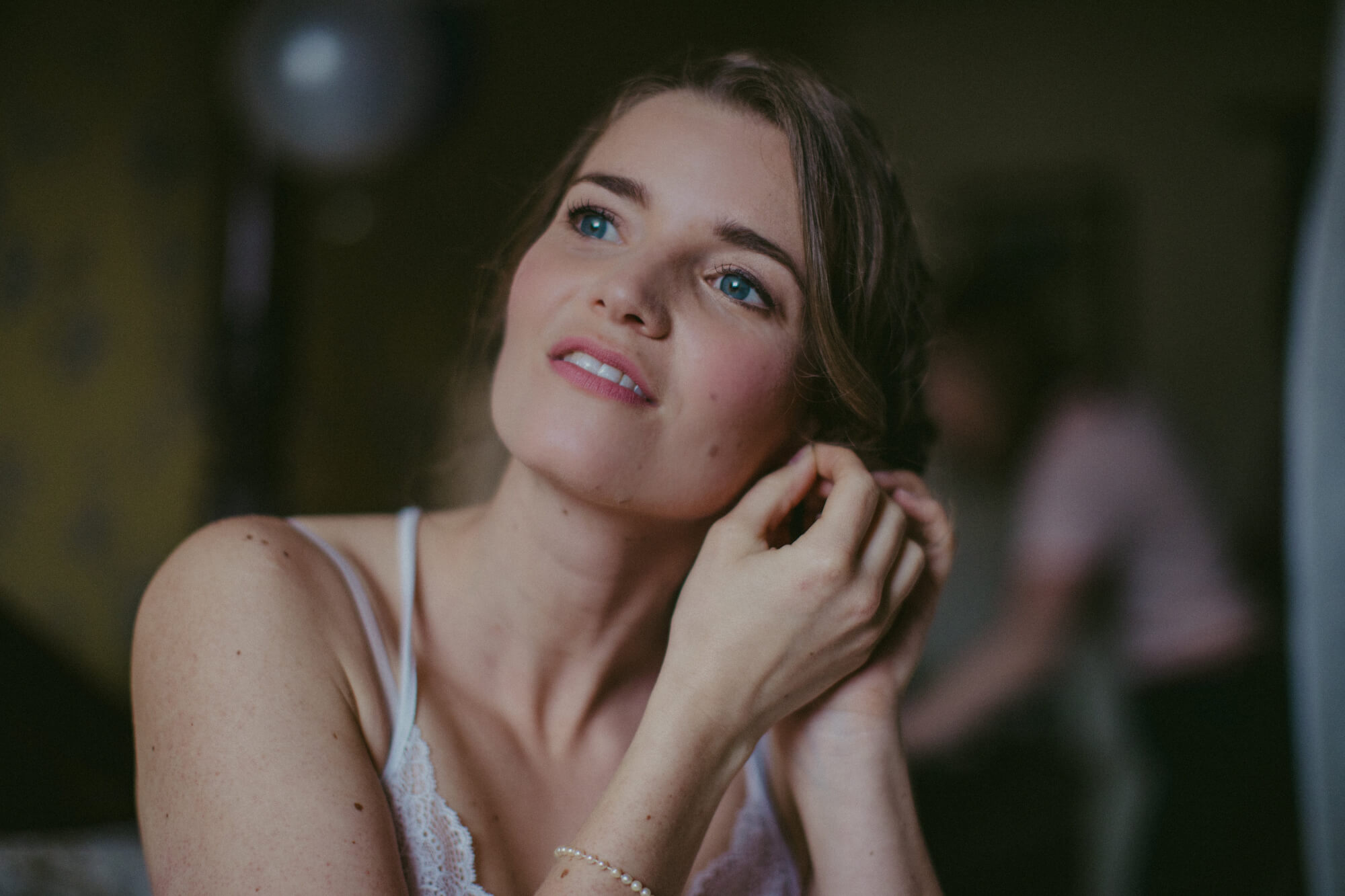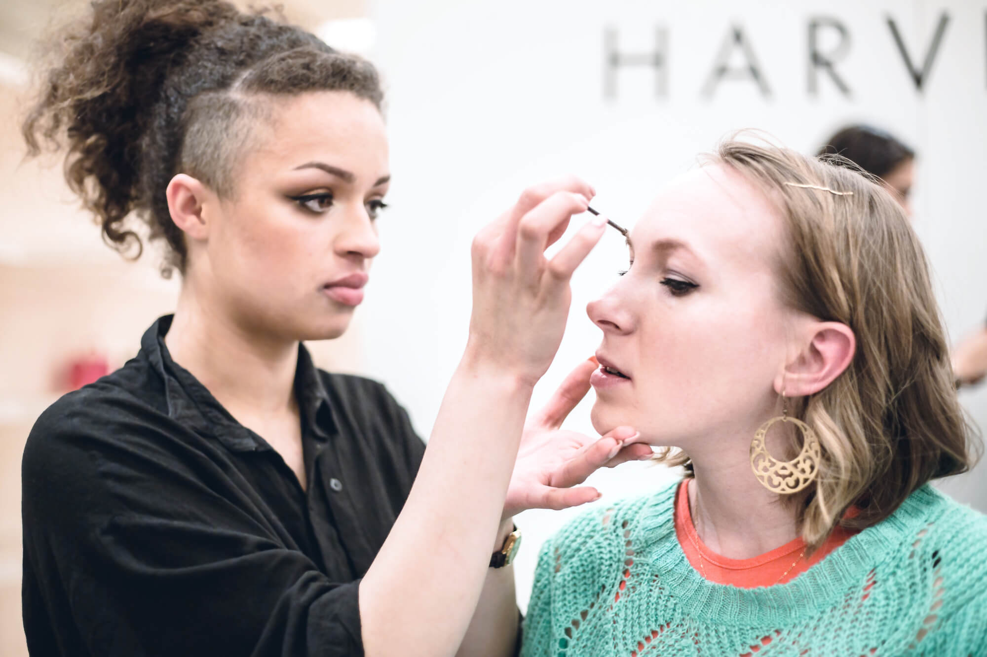 Evie, a makeup artist, wearing a white jumper,looking down as she writes in a notepad